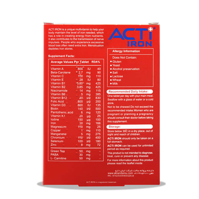 قرص اکتی آیرون لیبرتی سوئیس شامل انواع ویتامینها و مواد معدنی به همراه عصاره چای سبز است که به سلامت عمومی بدن، پیشگیری و رفع کم خونی بدن کمک میکند.